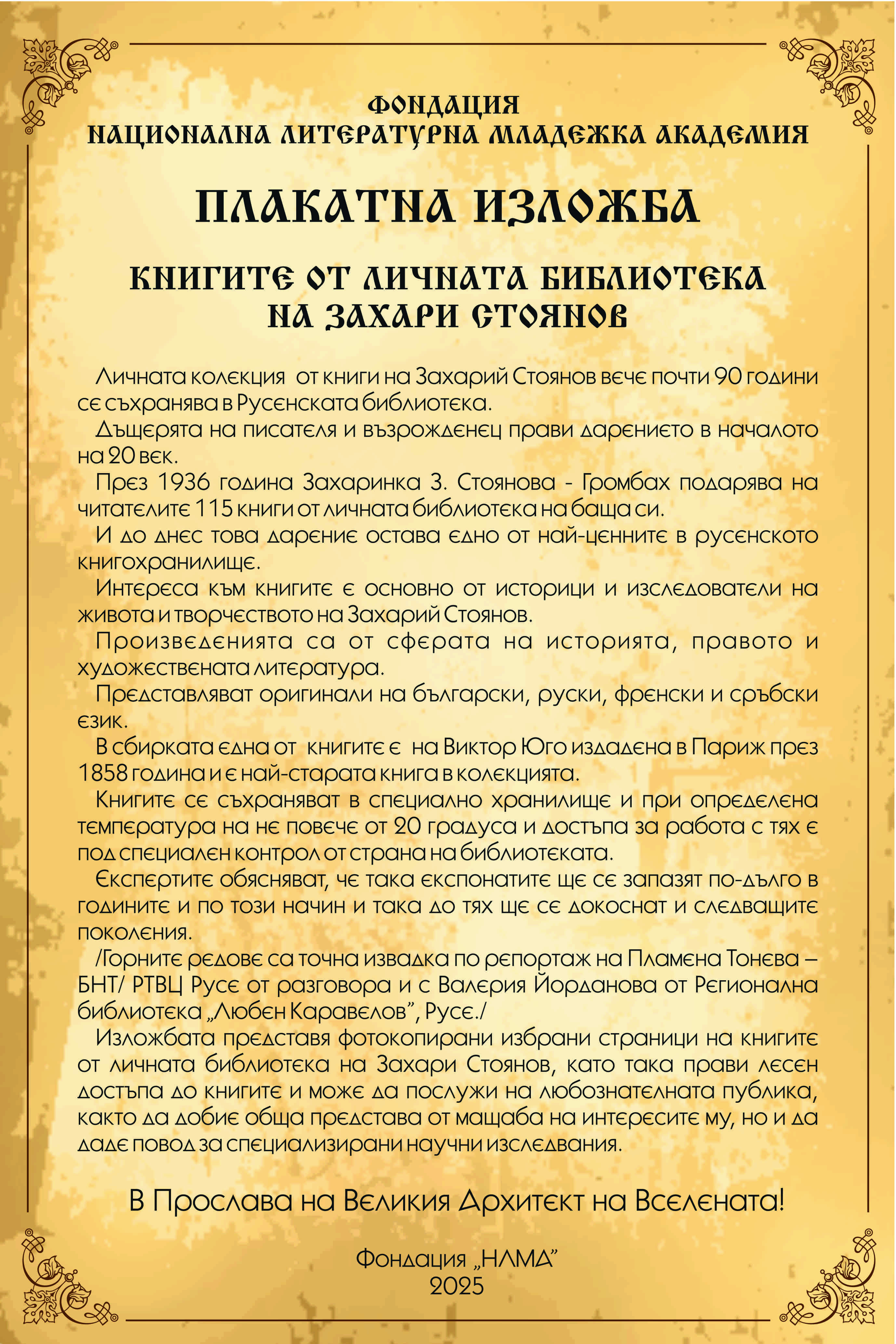 Сдружение „За старите зидари“ оказа организационна и финансова подкрепа на Фондация „Национална литературна младежка академия“ за реализирането на една значима културна инициатива – представянето чрез плакатна изложба на личната библиотека на Захарий Стоянов.